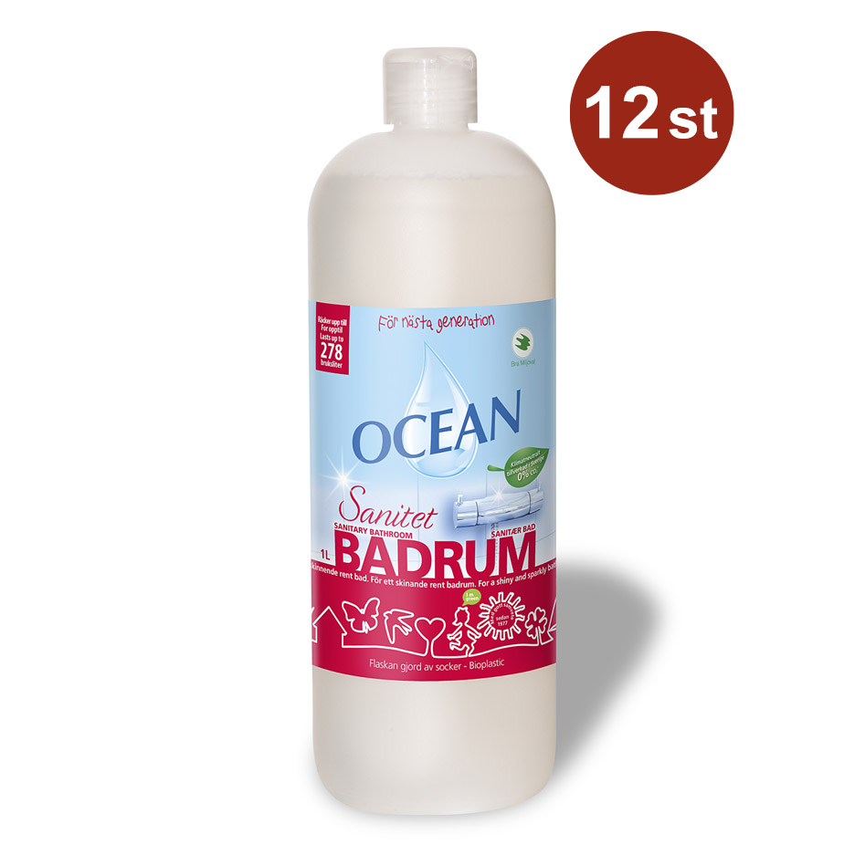 Ocean Sanitet Badrum avlägsnar enkelt mögel på kakel och tar snabbt bort kalkavlagringar på handfat med hjälp av mjölksyra. Produkten har ett lågt pH-värde som gör att den verkar bakteriedödande. Med Sanitet Badrum rengör du effektivt kranar och badkar och tar lätt bort gamla tvålrester. Ditt badrum kommer inte bara att dofta fräscht, det blir blänkande och som nytt.