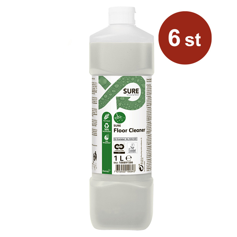 SURE Floor Cleaner är en del av ett unikt sortiment av växtbaserade, 100% biologiskt nedbrytbara, professionella rengöringsprodukter för alla dina dagliga rengöringsbehov. SURE Floor Cleaner är ett koncentrerat lågskummande golvrengöringsmedel för alla vattentåliga hårda golv. Rekommenderad för alla städmetoder inklusive hink och kombiskurmaskin applikationer. Produkten är miljömärkt med EU-Ecolabel.