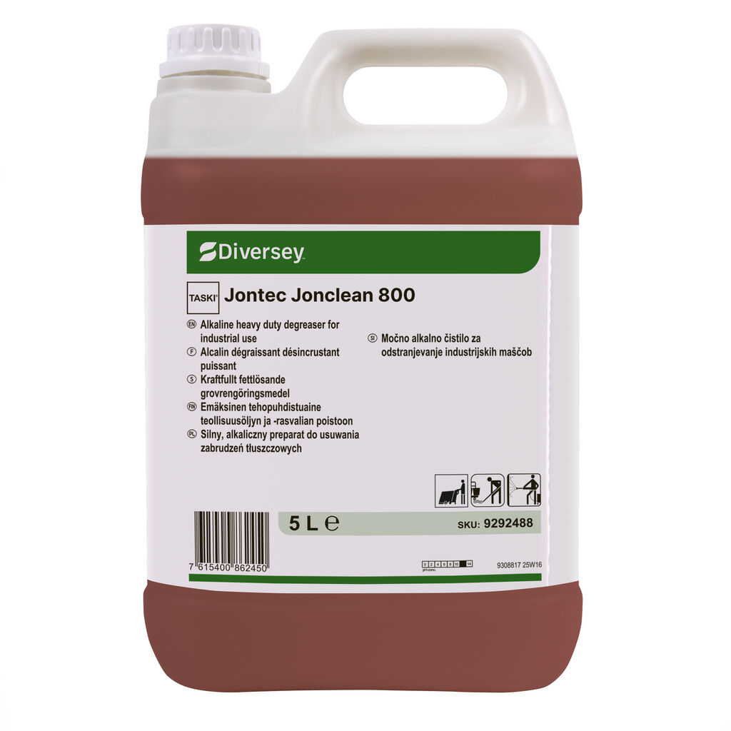 Rengöringsmedel Diversey Taski Jontec Jonclean 800 Starkt Alkaliskt 5L är ett starkt alkaliskt avfettnings- och rengöringsmedel för alla typer av obehandlade hårda golvmaterial. Produkten är särskilt framtagen för att effektivt avlägsna svår smuts, fett och oljerester på industriella ytor.