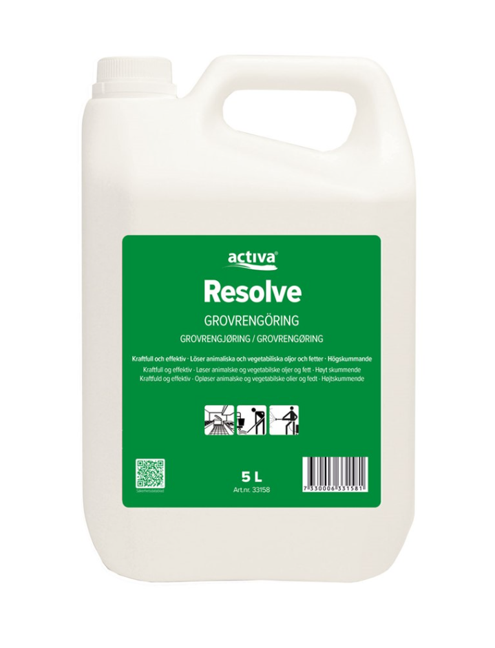 Activa Resolve är ett kraftfullt alkaliskt skumrengöringsmedel speciellt framtaget för storkök, industri och verkstadsrengöring. Produkten är effektiv på ytor som kakel, rostfritt stål, klinkerplattor, fritöser och grillar. Den har mycket god rengöringseffekt även vid låg temperatur och är aluminiumsäker, vilket gör den säker att använda på många olika metallytor. Produkten har en neutral doft för bekväm arbetsmiljö.