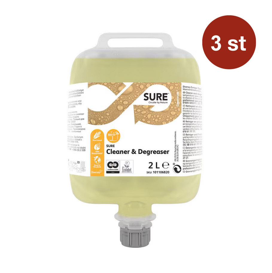 SURE Cleaner & Degreaser DvM är en del av ett unikt sortiment av växtbaserade, 100% biologiskt nedbrytbara, professionella rengöringsprodukter för alla dina dagliga rengöringsbehov. SURE Cleaner & Degreaser DvM är ett koncentrerat kraftfullt avfettningsmedel i en refillpåse för rengöring av alla svårt nedsmutsade ytor i köket, såsom utrustning, spiskåpor, spisar och bordsytor. Även lämplig för kraftfull rengöring av golv. För optimal dosering ska SURE Cleaner & Degreaser DvM doseras i Diverseys Divermite dispensersystem.