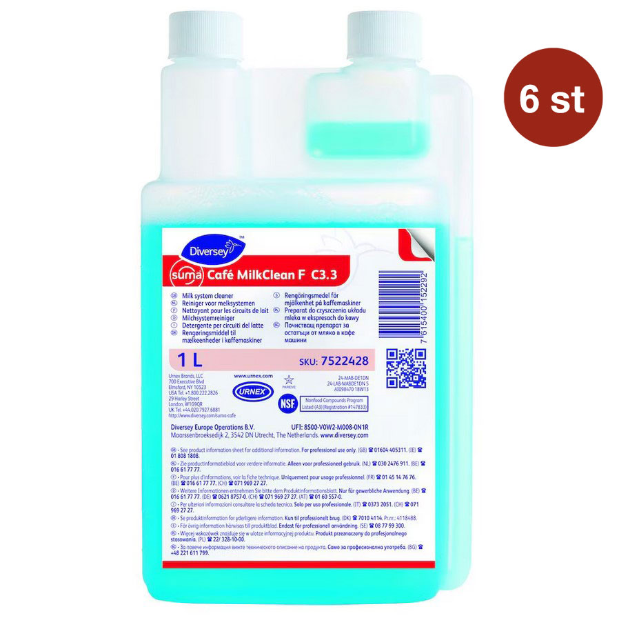 Suma Café MilkClean F är speciellt utvecklad för rengöring av mjölksystem på kaffe- och espressomaskiner där det finns behov av en syrabaserad rengöringslösning. Suma Café MilkClean F är en mångsidig produkt för daglig rengöring som enkelt tar bort mjölkrester som lätt ansamlas på utrustningen. Produkten är lämplig för automatiska mjölkskummare, manuella ångrör, mjölkkannor och mjölksystem i automatiska espressomaskiner. Rekommenderad för användning med Franke maskiner.