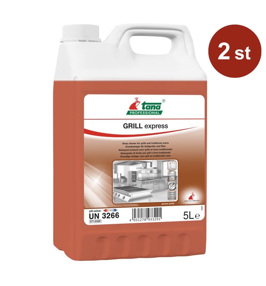 Ugns- och grillrengöringsmedlet Grill express från Tana Professional avlägsnar lätt och effektivt feta livsmedel och de envisaste fett- och smutsavlagringarna. Rengöringsmedlet för ugn och grill ger optimalt resultat och fungerar även på fastbränt fett. Med god vidhäftningsförmåga på lodräta ytor säkerställs att produkten stannar kvar där den appliceras. Behållarens spraymunstycke har dessutom en arbetsmiljövänlig skumfunktion som minskar spridningen av hälsofarliga aerosoler.