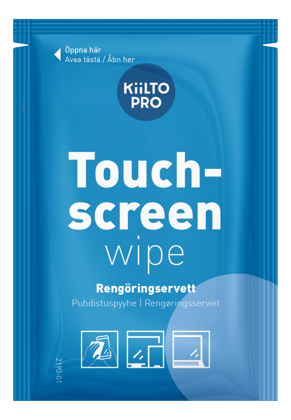 Kiilto Pro Touchscreen Wipes är singelförpackade, mjuka rengöringsservetter speciellt framtagna för hårda touchskärmar som mobiltelefoner, surfplattor, incheckningsskärmar och andra blanka displayer. Produkten rengör effektivt skärmen, ger blank yta och bidrar till minskad risk för smittspridning på ofta berörda ytor.