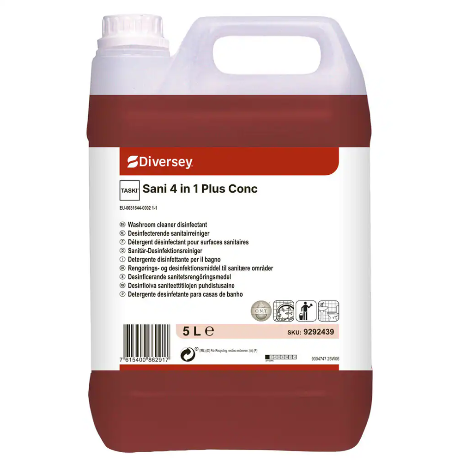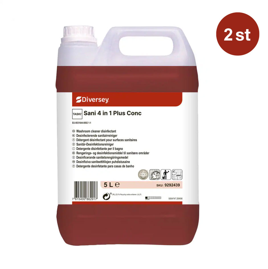 TASKI Sani 4 in 1 Plus Conc är ett syrebaserat rengöringsmedel, avkalkningsmedel, desinfektionsmedel och deodorant för tvättrum som rengör, avkalkar, desinficerar och desodoriserar i ett enda steg. Produkten är BPR-godkänd och effektiv mot bakterier, höljeförsedda virus och jäst. Den innehåller en unik patenterad luktneutraliserande teknik (O.N.T.) som ger en behaglig och fräsch doft efter användning.