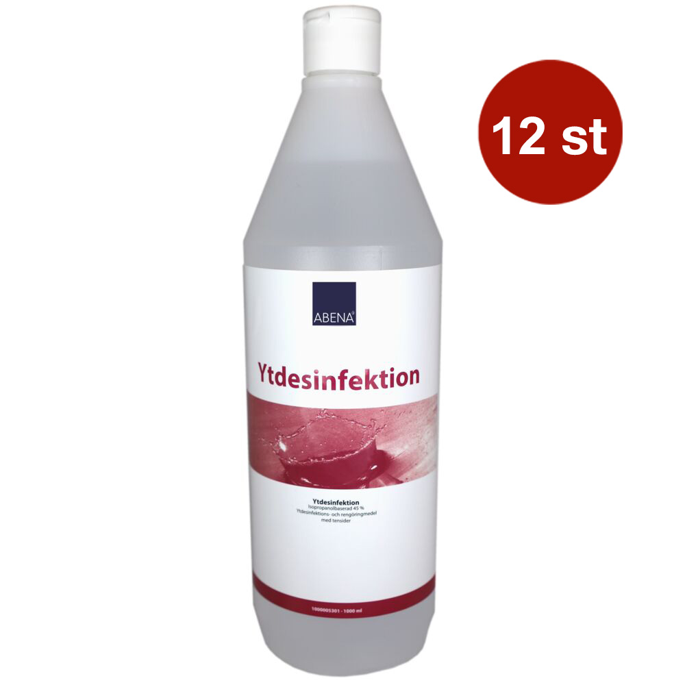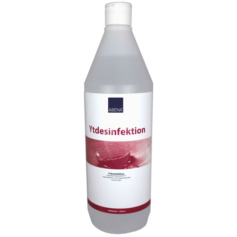 Abena Ytdesinfektion 45% är en isopropanolbaserad lösning för desinfektion och rengöring av alla vattentåliga ytor. Innehåller ytaktiva ämnen (med tensid) för att ha en renande effekt. Abena Ytdesinfektion 45% innehåller 45 vol-% isopropylalkohol. Godkänd för ytor som kommer i kontakt med livsmedel.