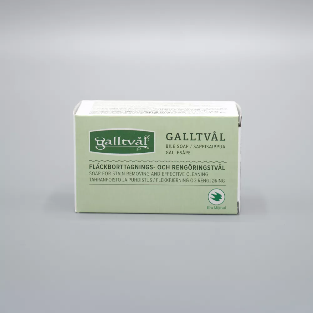 Galltvåls fasta rengörings- och fläckborttagningstvål är ett måste för alla som vill ha en smidig tvål för all sorts rengöring. Den innehåller bland annat oxgalla och klorofyll som är effektiva mot olja och fett respektive fläckar från gräs, bär, frukt och grönsaker. Tvålen innehåller inga kemiska ämnen, utan endast naturliga ingredienser och är biologiskt nedbrytbar. Galltvålen har inte testats på djur och är certifierad med Bra Miljöval.