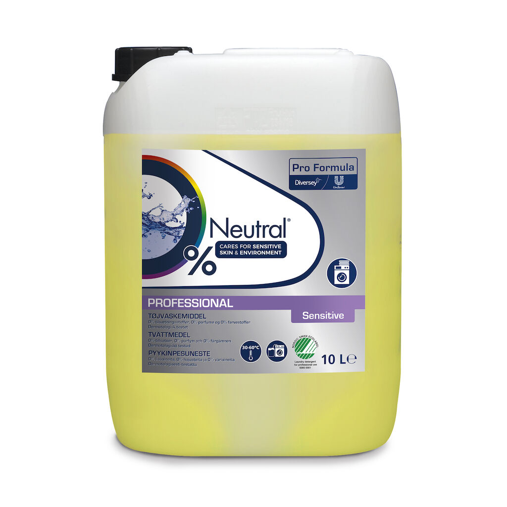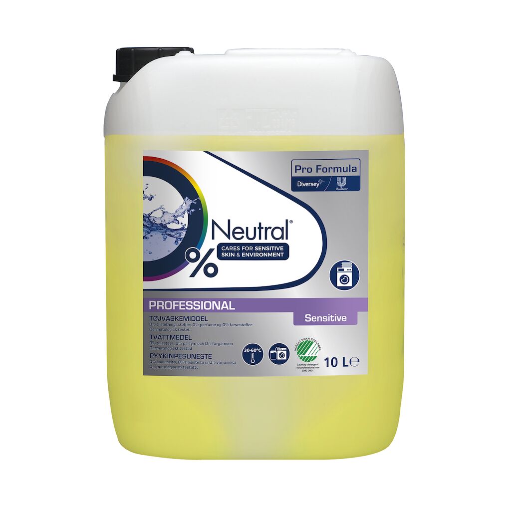Neutral Professional Detergent Sensitive är ett miljöcertifierat flytande tvättmedel som är speciellt framtaget för användning i kommersiella tvätterier och tvätt på plats. Produkten har utformats för automatisk och manuell dosering och kan användas i alla vattenhårdheter. Neutral Professional Detergent Sensitive är lämplig för tvätt av alla bomulls- och polyester-bomullstyger. För klassificeringar som kräver blekning/desinfektion bör Neutral Professional Detergent Sensitive användas tillsammans med ett blekmedel/desinfektionsmedel för låg temperatur för att uppnå maximal energi- och vattenbesparing och förlängd livslängd för linnet. Främst lämplig för tvätterier på plats och fastighetsstugetvätt.
