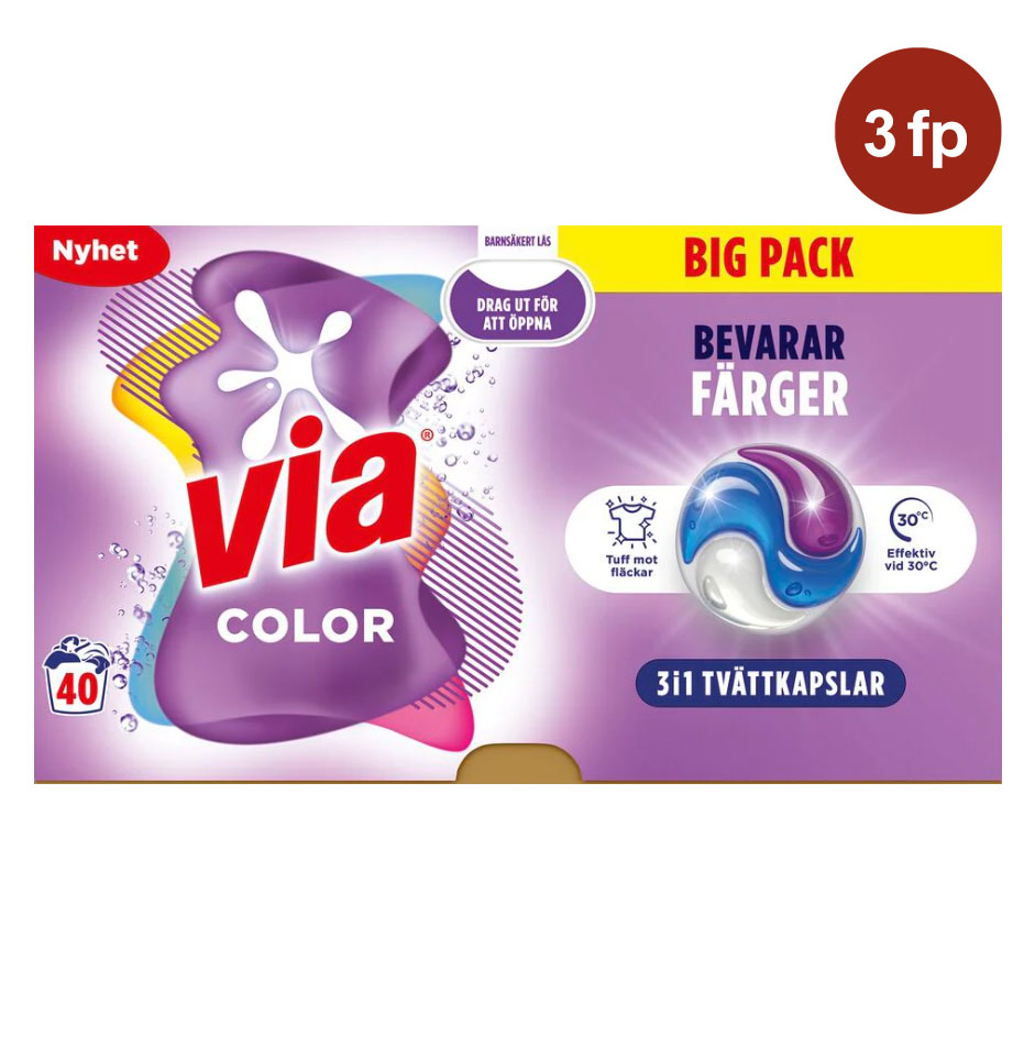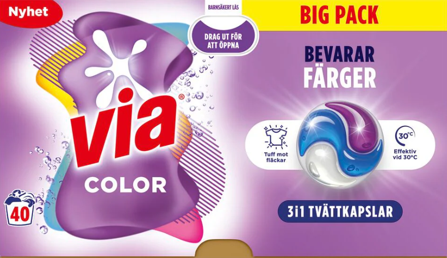 Via Color Tvättkapslar Clean+Care är färdigdoserade tvättmedelskapslar med ett effektivt tvättkoncentrat som gör det enkelt att få rena och fräscha kulörta kläder. Kapslarna är särskilt formulerade för att hjälpa till att bevara plaggets färger och lyster samtidigt som de tar bort smuts och fläckar på djupet. Via tvättkapslar är lätta att använda och eliminerar behovet av doseringsmått.