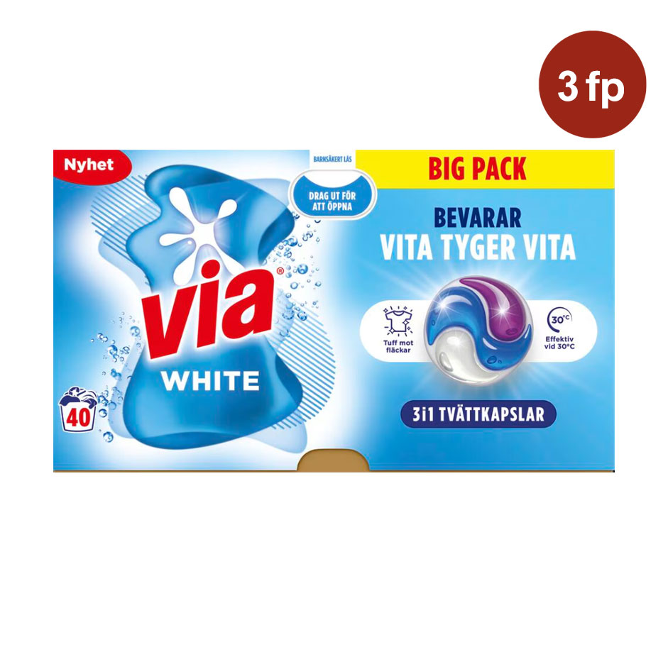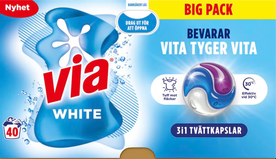 Via White Tvättkapslar är färdigdoserade tvättmedelskapslar som är särskilt framtagna för att ge effektiv rengöring och bibehållen vithet på vita och ljusa textilier. Kapslarna innehåller ett koncentrerat tvättmedel som löser upp smuts och fläckar samtidigt som de hjälper till att hålla plaggen fräscha och klara tvätt efter tvätt. Den smidiga kapselformen gör doseringen enkel och säker.