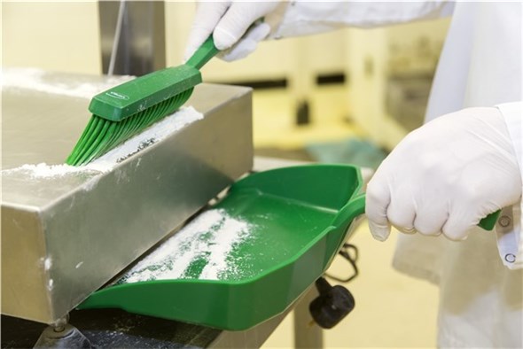 Ta bort mjöl och fina partiklar från transportband, beredningsytor, bord och utrustning med denna handborste.