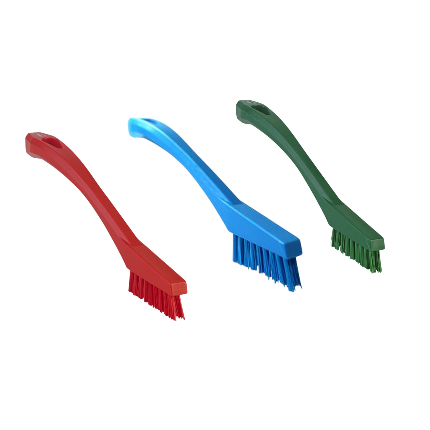 Varumärke Vikan Typ Handborstar Kategori Borstar Material Polypropylen, Syntetfiber Färg Blå, Röd, Grön Hårdhetsgrad Hård Längd 20.5 cm Användning Liten kompakt handborste som är perfekt för rengöring vid trånga utrymmen såsom gummilister,maskiner och transportband - Produktblad