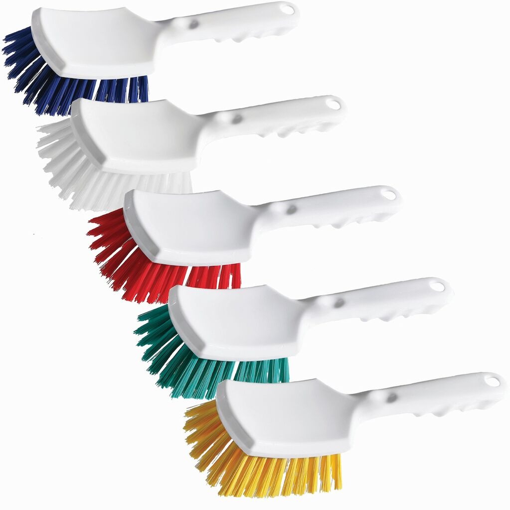 Diverseys handtagsborstar är mångsidiga och kan användas i många olika applikationsscenarier. Borstarna är färgkodade och uppfyller HACCP-kraven. Borstarna är tillverkade av robust polypropylen och är värmebeständiga upp till 140°C. Det korta hantaget rekommenderas för rengöring och skrubbning av områden som är lätta att nå. De hårda borststråna avlägsnar även envis smuts. Handskurborste med kort skaft hård.