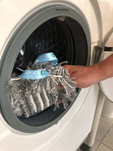 Tvätta textilierna snarast möjligt efter användning för att undvika att smuts fastnar och orsakar fläckar eller lukt. Första tvätten ska ske separat i minst 85°C. Tvätta dukar och olika mopptyper var för sig för att undvika luddöverföring. Förtvätta helst i ljummet vatten utan kemikalier för att avlägsna rester från städning som annars kan påverka resultatet negativt vid högre temperaturer. Undvik klorprodukter, såpa, zeoliter, mjukgörare och oxiderande kemikalier då de skadar fibrerna och försämrar absorptionen.