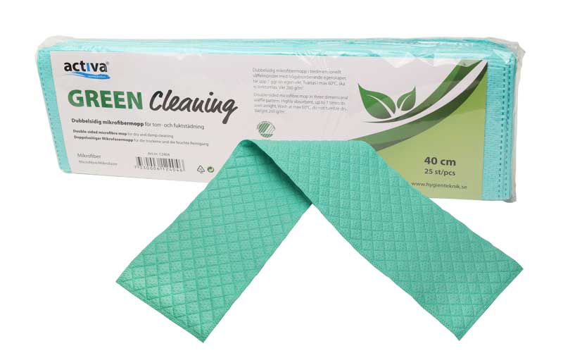 Dubbelsidig mikrofibermopp i ett tredimensionellt våffelmönster med mycket hög absorptionsförmåga. Activa Green Cleaning kan ta upp cirka sju gånger sin egen vikt av vätska, fett och smuts. Båda sidorna fäster direkt på kardborrestativet, vilket innebär att inget mellanlägg behövs. Moppen kan användas som torr-, fukt- eller våtmopp och rengör effektivt även med enbart vatten. Den repar inte underlaget och klarar som fuktmopp cirka 30 m² arbetsyta per sida. Den låga vikten gör moppen till ett energieffektivt och lättanvänt alternativ.
