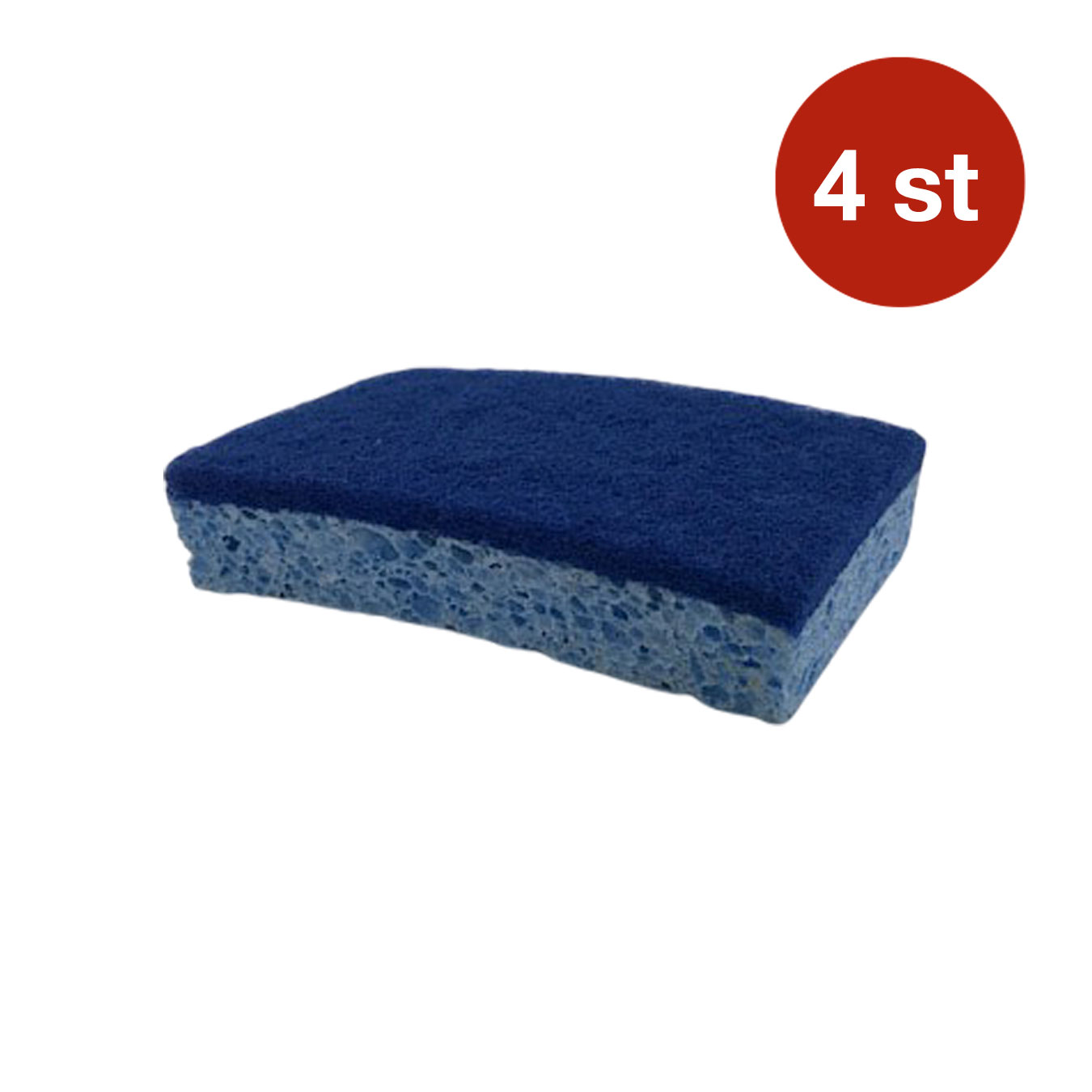 Blå cellulosasvamp med blått skurnylon utan slipmedel på ena sidan. Lämplig till fönsterputs, ska användas blöt.