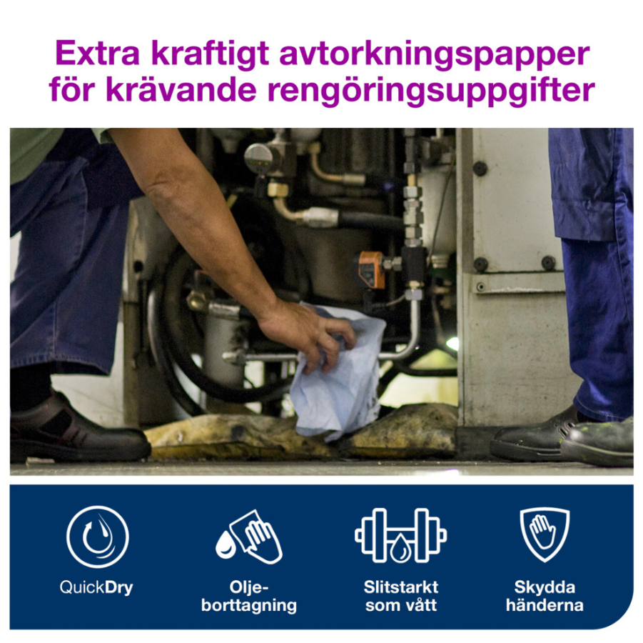 Skydda händerna mot smuts och värme med vårt kraftiga 3-lagers Tork Avtorkningspapper Extra Kraftigt. Detta industriella avtorkningspapper i allround-kvalitet har överlägsen slitstyrka och absorptionsförmåga för att snabbt kunna avlägsna utmanande substanser som olja och fett. Använd rullen med Tork Dispenser Vikta dukar för top-pack som håller refillerna rena och hygieniska. Dispenserns utmatning av ett papper i taget reglerar förbrukningen och minskar avfall och kostnader.