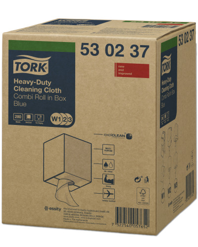 Tork Rengöringsduk Kraftig Premium Blå är en mångsidig och slitstark rengöringsduk som är designad för professionell användning i både vård och industrimiljöer. Duken har hög absorptionsförmåga, är tjock och hållbar och klarar kraftig gnuggning utan att trasas sönder. Den skyddar händerna mot metallspån, hög värme och tuffa arbetsförhållanden samtidigt som den effektivt avlägsnar olja, fett, smörjmedel och envis smuts. Produkten är kompatibel med de flesta lösningsmedel och kan användas både torr och med rengöringsmedel. Den passar i Tork golv- eller väggställ samt i Tork Dispenser Maxi Centrummatad och Tork Dispenser Rulle i box, som alla är utformade för enkel användning med en hand.