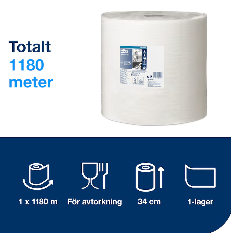 Tork Advanced Industritorkrulle Vit 1180 m är ett mångsidigt 1-lagers avtorkningspapper som är särskilt lämpligt för lätt avtorkning och handavtorkning. Pappret fungerar utmärkt för rengöring av glas då det inte lämnar ludd eller ränder. Används tillsammans med Torks golv- eller väggställ (W1), som erbjuder enkel och säker avrivning med en hand. Med sin höga kapacitet varar rullen länge och minskar behovet av frekventa påfyllningar.