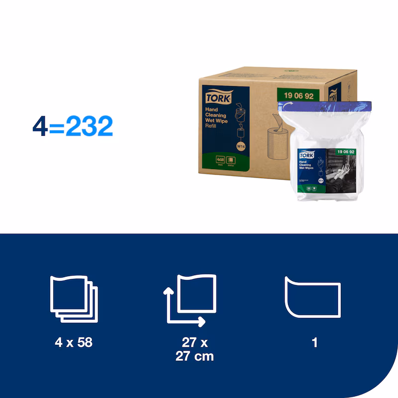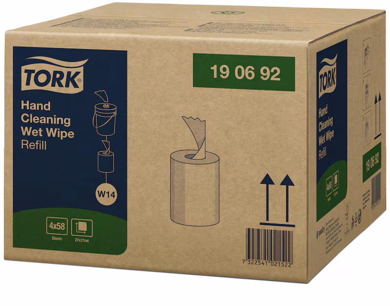 Tork Våtdukar för Handrengöring gör det bekvämt och effektivt att tvätta händerna utan tillgång till vatten och underlättar påfyllning.