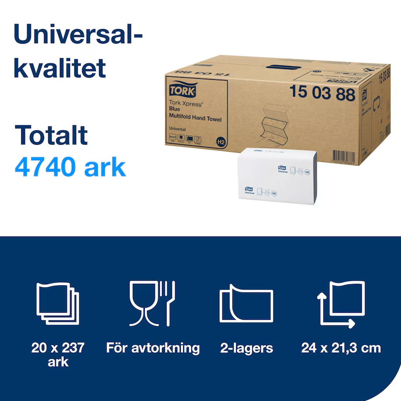 Uppfyll behovet av handavtorkning med Tork Xpress® Multifold Handduk i Universal kvalitet som ger ett bra värde för pengarna. Dessa handdukar passar i Tork Xpress® Dispenser Multifold Handduk för toalettutrymmen med medelhög besöksfrekvens. Dispensern får plats i små utrymmen och erbjuder dina gäster både komfort och hygien.