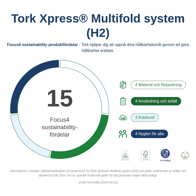 ● Tork Xpress® Multifold har ett genomsnittligt koldioxidavtryck (cradle-to-grave) på 11,7 g CO2e per användning, där cradle-to-gate delen står för 8,0 g CO2e per användning.**