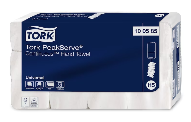 Tork PeakServe®: den senaste innovationen utformad för högtrafikerade toalettutrymmen där personalen måste maximera städtiden och upprätthålla ett bra besöksflöde. Dispensersystemet är kompatibelt med Tork PeakServe® Continuous™ handdukar. Systemet har en hög kapacitet på över 2 100 handdukar och kan mata ut ark snabbt och utan avbrott för att behålla flödet. De komprimerade refillerna kan fyllas på smidigt när som helst. Dessutom är de enkla att förvara och transportera, så att personalen kan fokusera på städbehovet istället för påfyllningsbehovet.