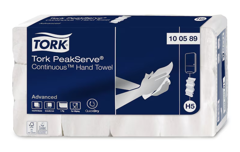 Tänk på dina gästers komfort med Advanced Tork PeakServe®-handduken: den torkar händerna ordentligt och har en trevlig mönsterpräglad grå lövdekoration. Tork PeakServe® är den senaste innovationen utformad för högtrafikerade toalettutrymmen där personalen måste maximera rengöringstiden och upprätthålla ett bra besöksflöde. Systemet är kompatibelt med Tork PeakServe®-dispensern och har en hög kapacitet på över 2 100 handdukar som kan matas ut snabbt och utan avbrott för att behålla flödet. De komprimerade refillhanddukarna kan fyllas på smidigt när som helst, och de är dessutom enkla att förvara och transportera, så att personalen kan fokusera på rengöring.