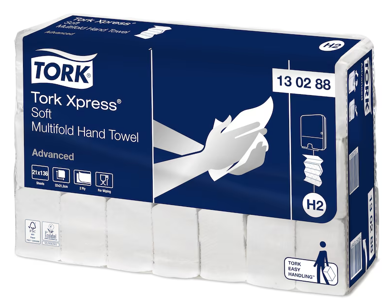 Med behagliga Tork Xpress® Mjuk Multifold Handduk i Advanced design får dina besökare en bekväm och utmärkt handavtorkning. Handdukarna är skonsamma mot huden och förmedlar en känsla av hög kvalitet. De passar i Tork Xpress® Dispenser Multifold Handduk för toalettutrymmen med medelhög besöksfrekvens. Dispensern får plats i små utrymmen och erbjuder dina gäster både komfort och hygien.