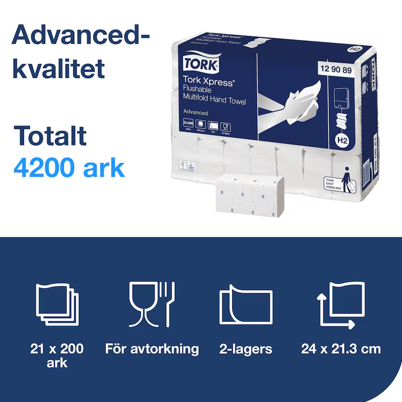Tork Xpress® Mjuk Multifold Handduk - Spolbar är idealisk för utrymmen där handdukarna kanske kastas i toaletten istället för i papperskorgen. Handduken passar i Tork Xpress® Dispenser Multifold Handduk. Dispensern matar ut en handduk i taget vilket minskar förbrukningen och avfallet samtidigt som hygienen förbättras.