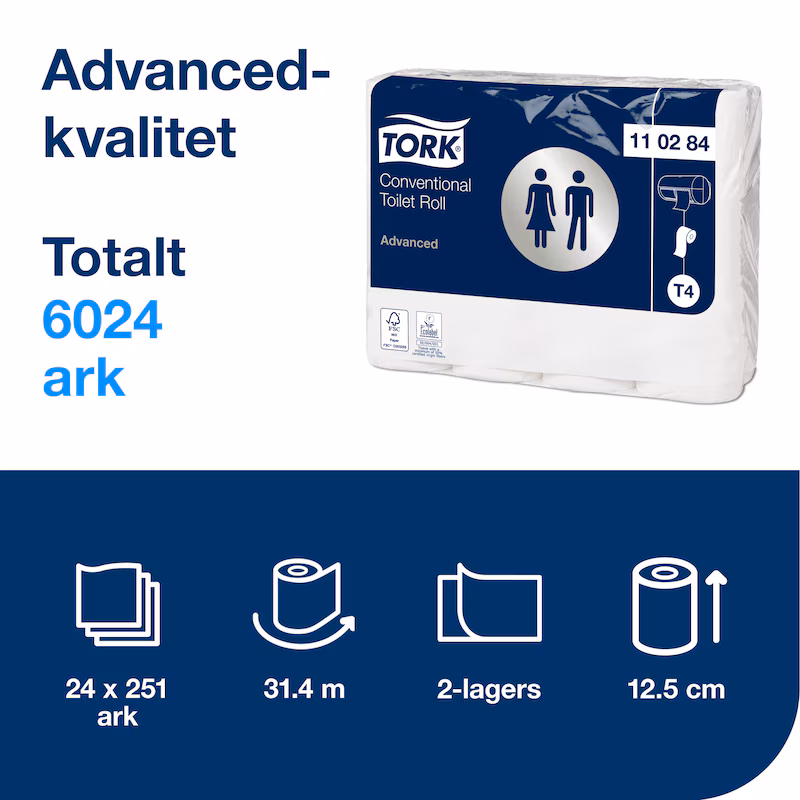 Toalettpapper Tork Advanced T4Förse dina gäster med samma komfort som hemma – Tork Extra Långt Toalettpapper har en attraktiv design och stora, långa ark. Det passar toalettutrymmen med låg besöksfrekvens som kräver både prestanda och kostnadseffektivitet då de perforerade arken ger snabb och enkel användning. Påfyllningar är enkla med Tork Easy Handling® förpackning som gör det lätt att transportera och slänga förpackningen. Använd med Tork Dispensrar för toalettpapper. Den slutna designen skyddar pappret för förbättrad hygien. Produktion utan fossila CO2 utsläpp* *Vi ersätter fossil naturgas med hållbar biogas under normala driftförhållanden (dvs. utom vid till exempel underhållsstopp och uppstart) samt använder certifierad förnybar el vid bruket i Lilla Edet.
