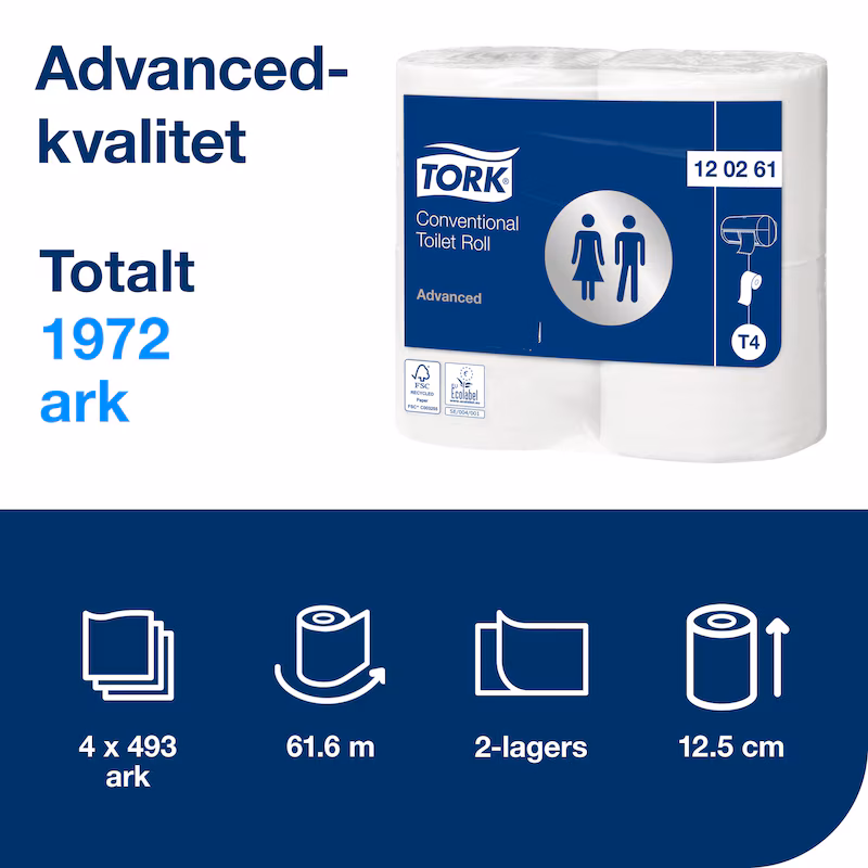 Ge gästerna samma komfort som hemma med extra långt toalettpapper i Advanced-kvalitet från Tork. Det här är ett kostnadseffektivt och funktionellt toalettpapper – perfekt för toalettutrymmen med låg besöksfrekvens.