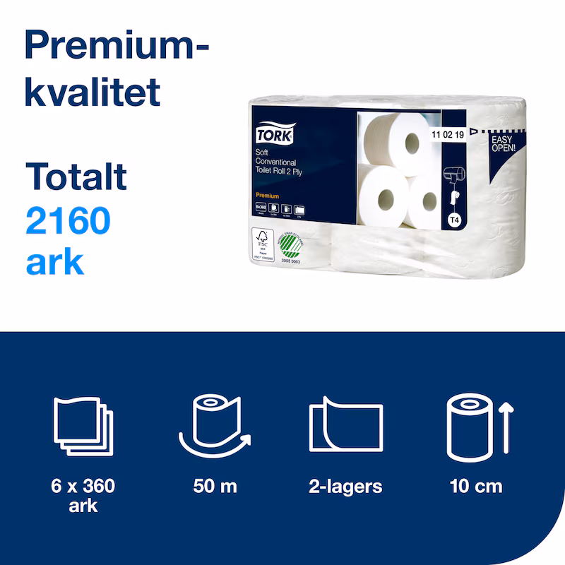 Toalettpapper Tork Mjukt Premium T4Ge dina besökare samma komfort som hemma med Tork toalettpapper i premiumkvalitet. Detta mjuka toalettpapper erbjuder överlägsen look och känsla med rätt funktioner för toalettutrymmen med låg besöksvolym.