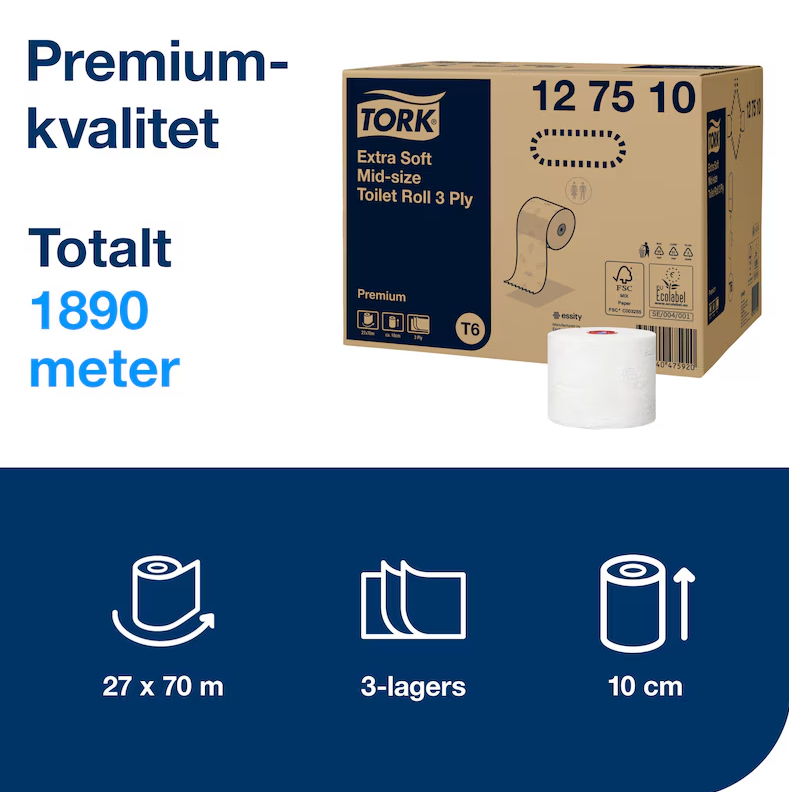 ● Tork Dispenser Mid-size Twin Toalettpapper är ett modernt och effektivt system som passar perfekt för toalettutrymmen med låg till medelhög besöksfrekvens och där man har högt fokus på att besökarna är nöjda. Systemet garanterar hög effektivitet och att toalettpapper alltid är tillgängligt. Tork Mid-size Extra Mjukt Toalettpapper erbjuder förstklassigt utseende och känsla med rätt funktioner.