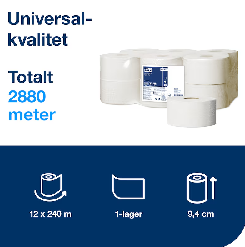 ● Systemet Tork Mini Jumbo innebär effektivt utnyttjande av tiden, minskade kostnader och erbjuder mycket mer toalettpapper än standardrullar. Tork Mini Jumbo Toalettpapper Universal-1-lagers tillgodoser de grundläggande behoven i ett toalettutrymme, erbjuder bra värde för pengarna och är lämpligt för platser med medelhög till hög besöksfrekvens.
