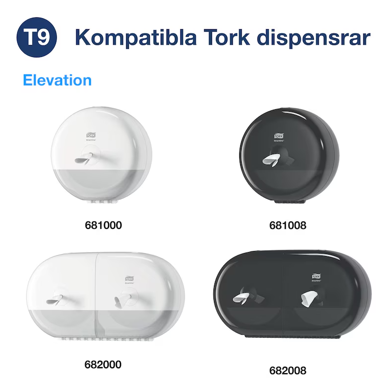 ● Matar ut ett hygieniskt ark i taget, vilket minskar förbrukningen med upp till 40 % jämfört med traditionella dispensrar för jumborullar.