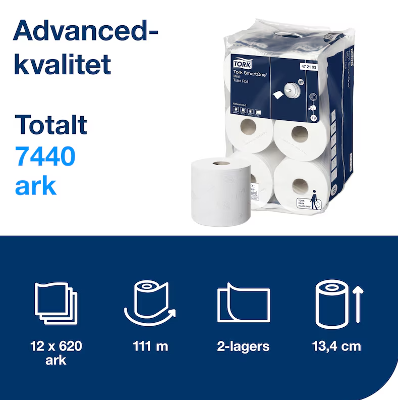 ● Tork SmartOne® Mini Toalettpapper är unikt i och med att det matar ut ett hygieniskt ark i taget, vilket hjälper till att minska förbrukningen med upp till 40% jämfört med traditionella dispensrar för jumborullar och innebär fler besök per rulle. Tork SmartOne Mini med hög kapacitet är lämpligt för krävande toalettutrymmen med låg till medelhög till hög besöksfrekvens, beroende på vilken Tork SmartOne Mini-dispenser man väljer.