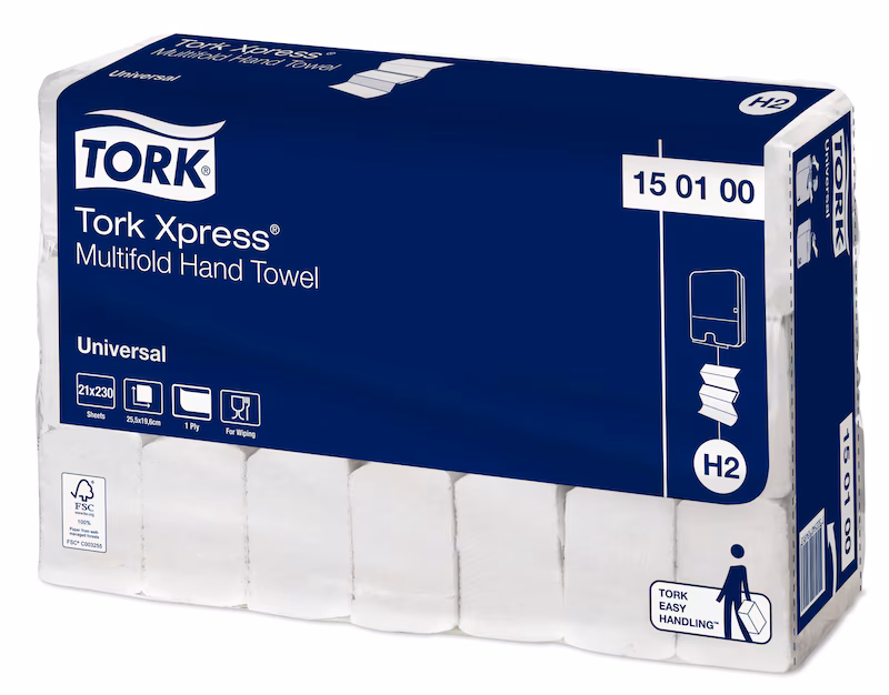 Uppfyll behovet av handavtorkning med Tork Xpress® Mjuk Multifold Handduk i Universal kvalitet som ger ett bra värde för pengarna. Dessa handdukar passar i Tork Xpress® Dispenser Multifold Handduk för toalettutrymmen med medelhög besöksfrekvens. Dispensern får plats i små utrymmen och erbjuder dina gäster både komfort och hygien.