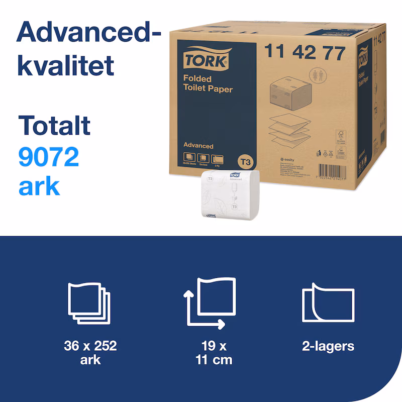 Varumärke Tork EAN 7322542214077 Typ Vikta toalettpapper Kategori Mjukpapper Färg Vit Bredd 11 cm Höjd 9.5 cm Längd 9.5 cm Vikt 0.180 kg Antal st/fp 252 Antal fp/krt 36 Förpackning storlek 40x30x35.6 cm Bruttovikt 7.13 kg Ovikt längd 19 cm Ovikt bredd 11 cm Lager 2 Quality Advanced System T3 - Tork Dekor Nej - Produktblad