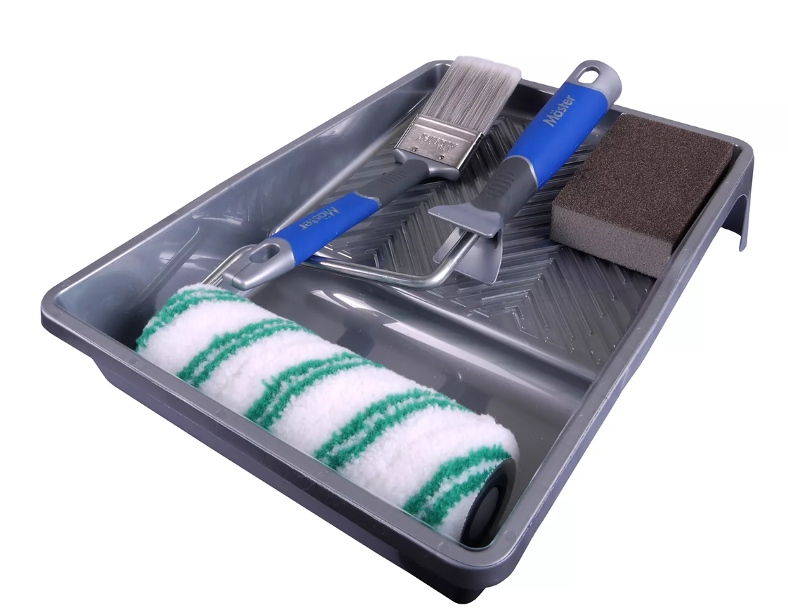 Rollern med medtex-material ger en mediumfin yta med hög kapacitet, medan vinkelpenseln möjliggör precisionsmålning av snickerier och hörn.