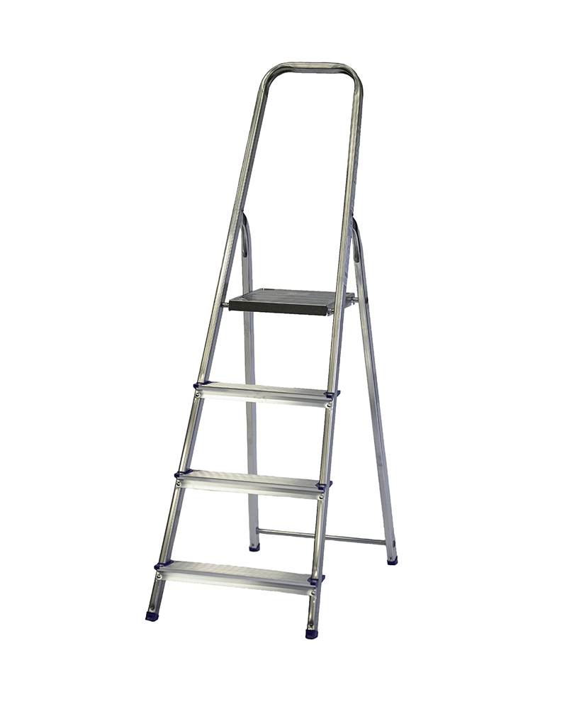 Praktisk trappstege tillverkad i aluminium med plattform i plåt, vilket gör att stegen är lätt och smidig att använda.