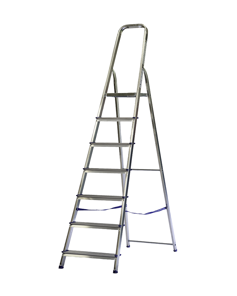Praktisk trappstege tillverkad i aluminium med plattform i plåt, vilket gör att stegen är lätt och smidig att använda.