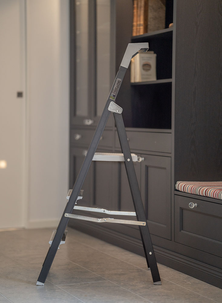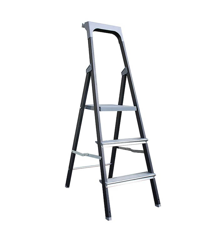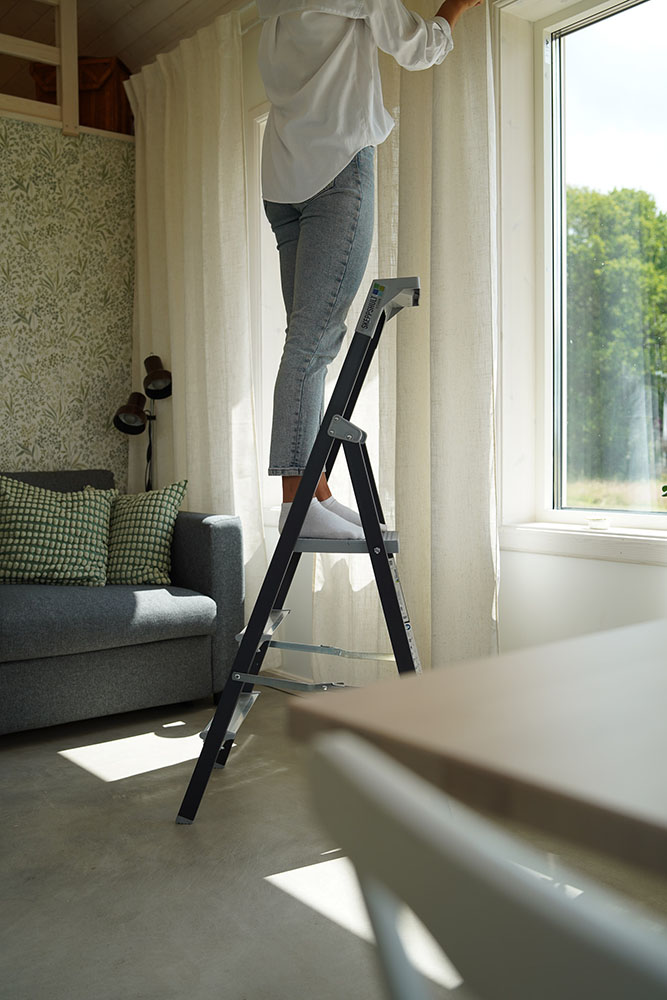 Det ger trappstegen en tåligare yta som inte svärtar av sig på händerna. Stor plattform och breda steg gör den säker att använda.